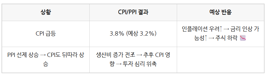 인플레이션이 높으면 중앙은행(미국 연준, FED)은 금리를 인상할 가능성이 커집니다. 이는 주식시장에 부정적 영향을 미치고, 채권금리나 환율에도 영향을 줍니다. 따라서 CPI와 PPI는 시장이 가장 민감하게 반응하는 경제지표 중 하나입니다.