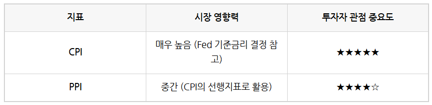 | 항목 | CPI (소비자물가지수) | PPI (생산자물가지수) |