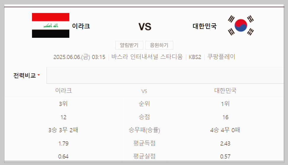 🇰🇷 대한민국 vs 🇮🇶 이라크 경기 정보